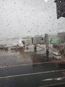雨で搭乗予定の飛行機が見えません。