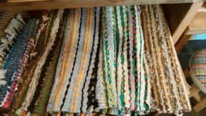 浴衣など古着を裂いて、紐状にしたものを思い思いに織ったマット。