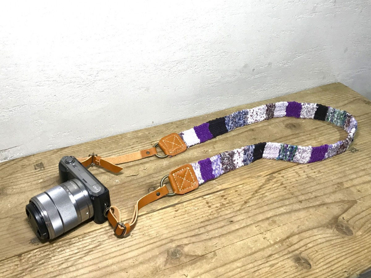 こちらもベルト同様、個性的なデザインがとても印象的♪メカニカルなカメラに、ナチュラルな風合いのストラップがとても引き立ちます。色のパターンは様々ですが、私が特にお気に入りなのはこちらの紫のパターン!甘すぎず、それでいて柔らかな色合いは性別問わず、しっくりくるカラーリングだと思います。