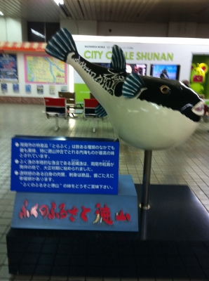 こんばんは! さっきPCのキーボードで“マジェルカ”と打ったつもりが“負けるか”と変換されました。 たった一文字変えるだけでMAKERUKAに。 なんとも素晴らしいではありませんか! くそ~っ負けるか! では、中国地方2日目、お間抜けな結末に終わった広島から、午後は山口へと移動。 帆布バッグを作っていただいている「周南あけぼの園」さんへとお邪魔致します。 途中の宮島や岩国も立ち寄ってみたいのですが、ここは新幹線で一気に徳山駅へ。 駅には佐々木さんが迎えに来てくださる事になっています。 佐々木さんに関してはhttp://blog.majerca.com/?eid=15 徳山駅に着くと早速佐々木さんが、じゃなかったフグが。 ふむふむ、へぇ~ ふ~ん( ´Д`)y━・~~あっ!そうだ佐々木さ~んε=ε=ε=ε=ε=ε=┌(; ̄◇ ̄)┘