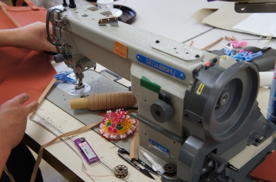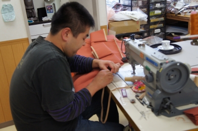 そのバッグの刺繍をしているタケちゃん! お洒落さんだそうで、さすがボーダーシャツ似合ってますね! 私も見習ってモミアゲきちんと揃えます! お次は革の工程です。