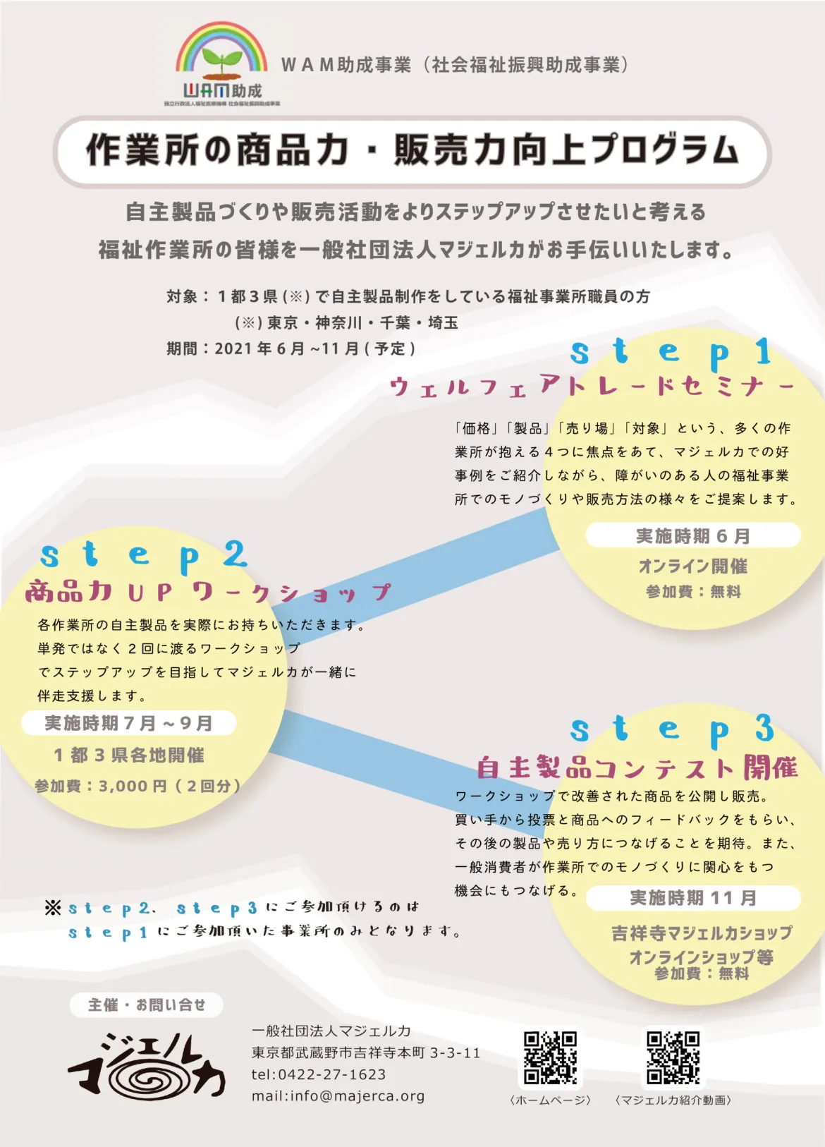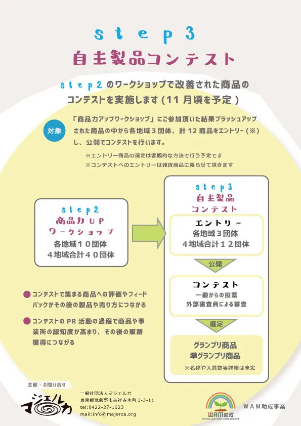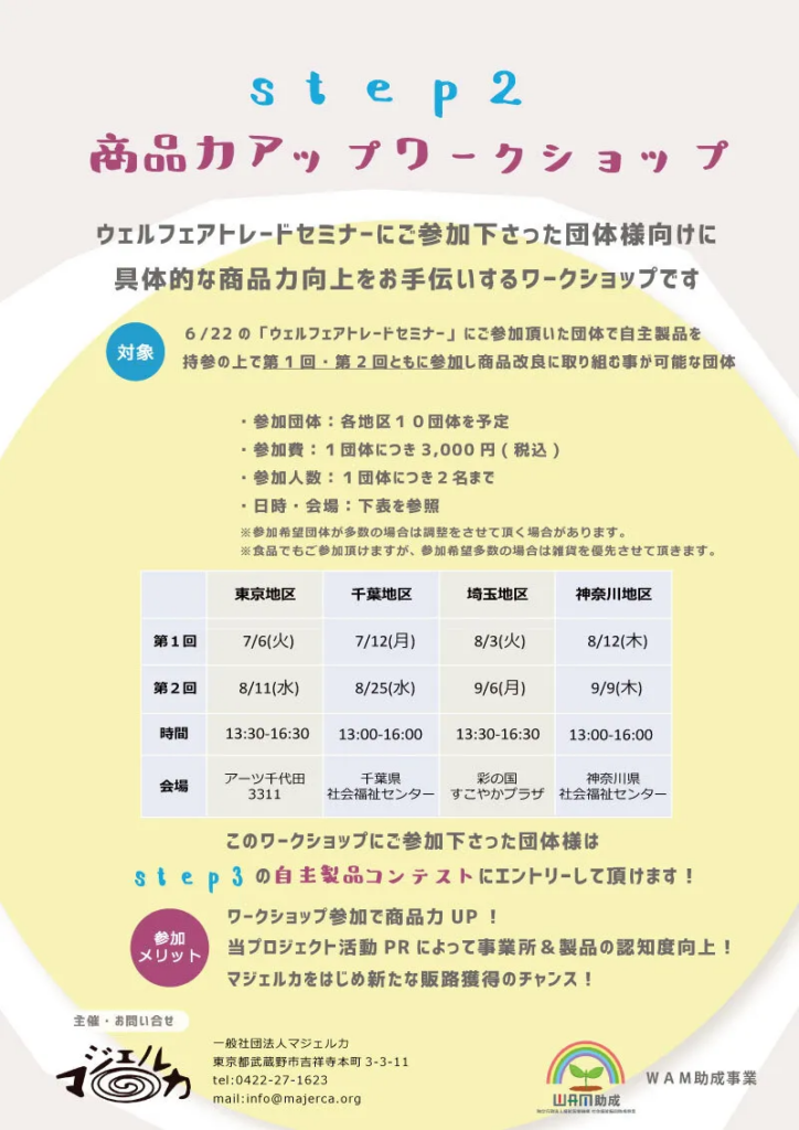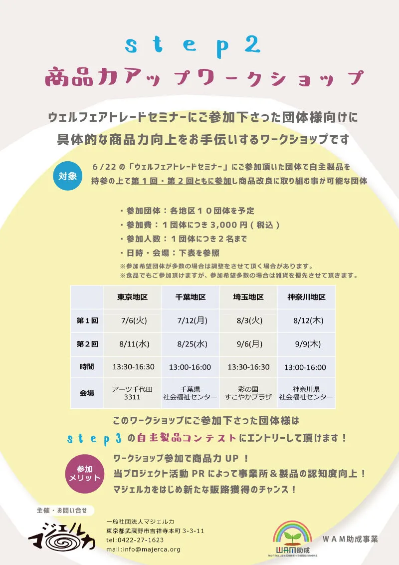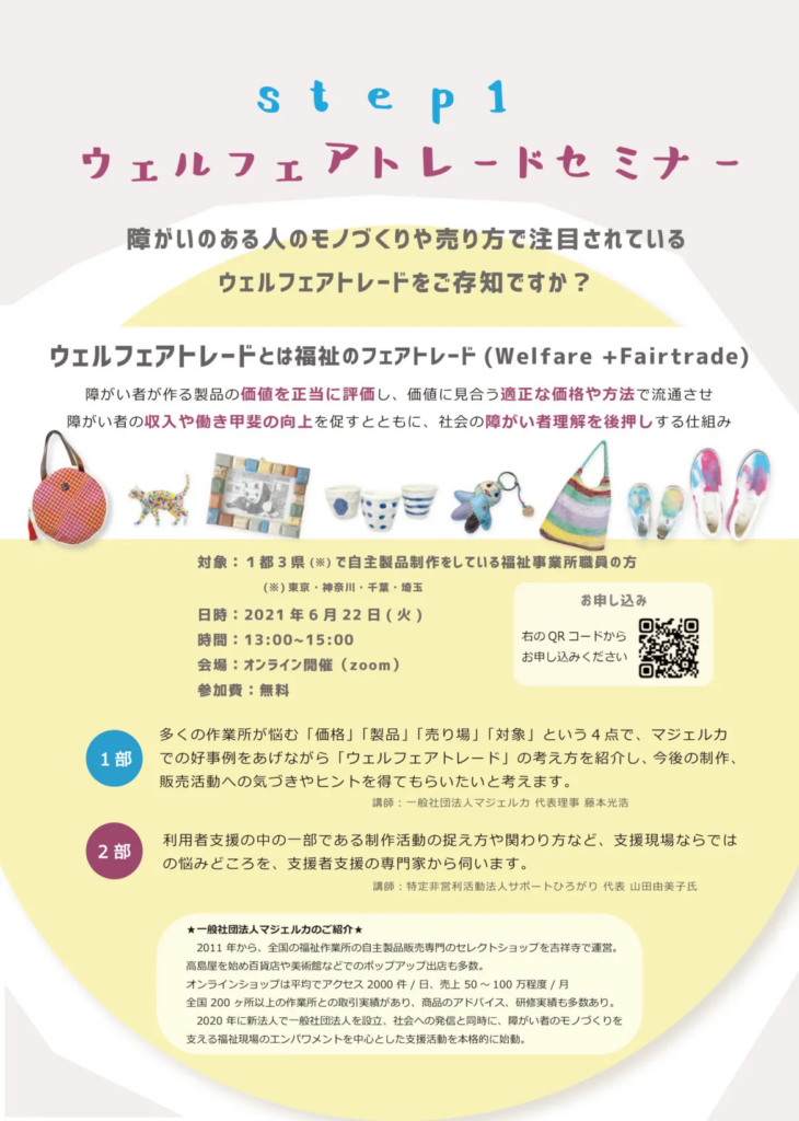 一般社団法人マジェルカはWAM助成事業(社会福祉振興助成事業)として、 モノづくりを行う福祉事業所の課題解決と社会の障がい者理解の促進を目的に、 セミナー、ワークショップ等の事業を行います。